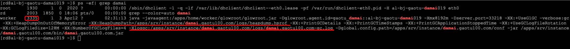 1) 查看当前应用运行情况信息,查看是否配置了 gc log:-Xloggc:/apps/srv/instance/damai.gaotu100.com/logs/damai.gaotu100.com-gc.log , 可以从 gc 日志中查到很多信息。