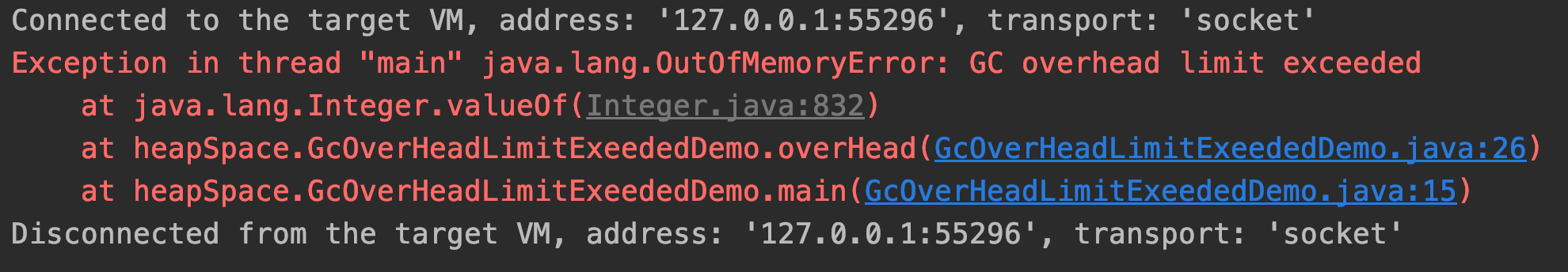 当 Java 进程花费 98% 以上的时间执行 GC ,但只恢复了不到 2% 的内存,且该动作连续重复了 5 次,就会抛出 java.lang.OutOfMemoryError:GC overhead limit exceeded 错误。简单地说,就是应用程序已经基本耗尽了所有可用内存, GC 也无法回收。