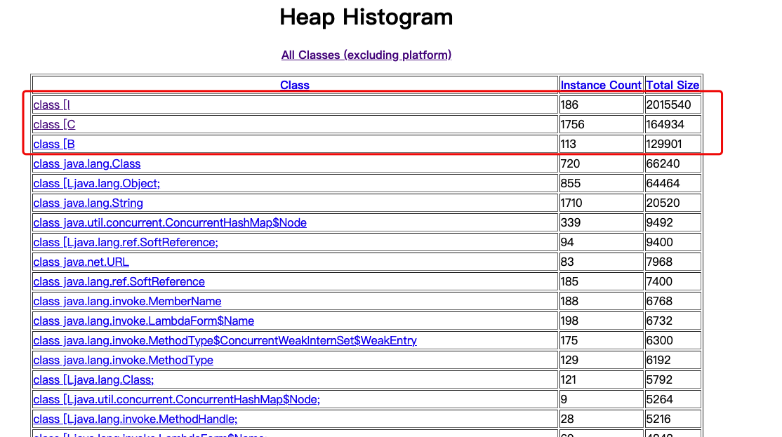 发现有 Class[I 占用最多, Class[I 表示的是 int 数组。 那我们就查下代码里用到 Class[I 中的地方,