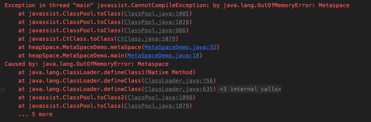 该错误表示 Metaspace 已被用满,通常是因为加载的 class 数目太多或体积太大。