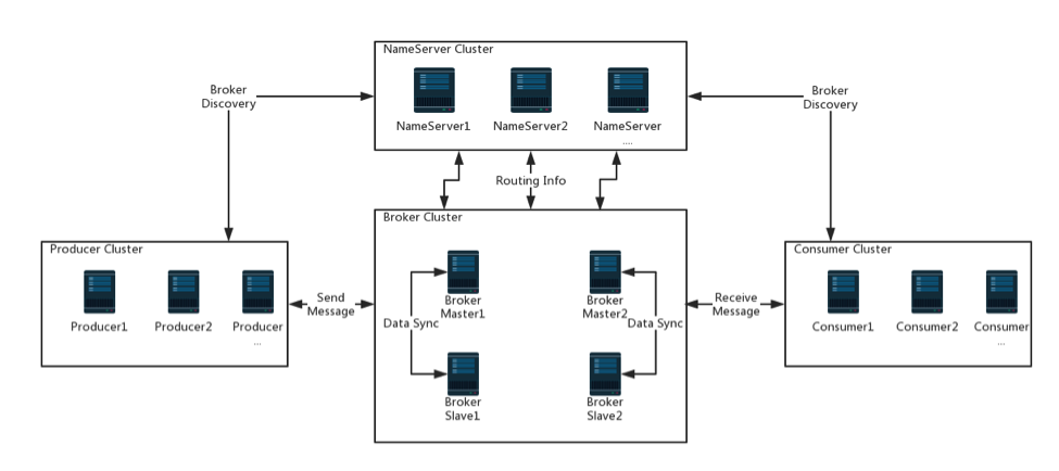 Apache RocketMQ 是一个分布式消息和流媒体平台,具有低延迟、高性能和可靠性、万亿级容量和灵活的可伸缩性。它由四部分组成: NameServer 、 Broker 、 Producer 和 Consumer 。它们中的每一个都是可以集群方式部署,都可以水平地扩展,而不需要单个故障点。如下图。