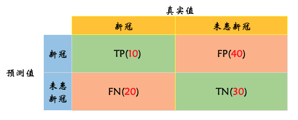 True Positive:TP, 真阳性,即预测结果是新冠,真实值也是新冠。True Negative:TN, 真阴性,即预测结果是未感染,真实也未感染新冠。