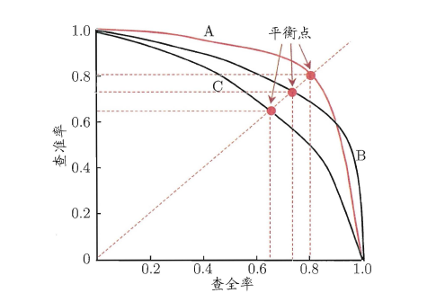 P-R 曲线如何评估呢?若一个 学习器A 的 P-R 曲线被另一个 学习器B 的 P-R 曲线完全包住,则称: B 的性能优于 A 。若 A 和 B 的曲线发生了交叉,则谁的曲线下的面积大,谁的性能更优。但一般来说,曲线下的面积是很难进行估算的,所以衍生出了 “平衡点”( Break-Event Point ,简称 BEP ),即当 P=R 时的取值,平衡点的取值越高,性能更优。