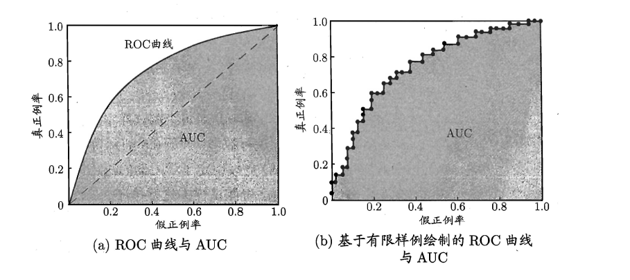 若一个学习器 A 的 ROC 曲线被另一个学习器 B 的 ROC 曲线完全包住,则称 B 的性能优于 A 。若 A 和 B 的曲线发生了交叉,则谁的曲线下的面积大,谁的性能更优。 ROC 曲线下的面积定义为 AUC ( Area Uder ROC Curve ),不同于 P-R 的是,这里的 AUC 是可估算的,即 AOC 曲线下每一个小矩形的面积之和。易知: AUC 越大,证明排序的质量越好, AUC 为 1 时,证明所有正例排在了负例的前面, AUC 为 0 时,所有的负例排在了正例的前面。