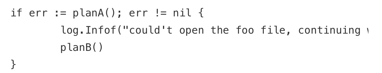 log.Info 只需将该行写入日志输出。不应该有关闭它的选项,因为用户只应该被告知对他们有用的事情。如果发生了一个无法处理的错误,它就会抛出到 main.main 。 main.main 程序终止的地方。在最后的日志消息前面插入 fatal 前缀,或者直接写入 os.Stderr 。