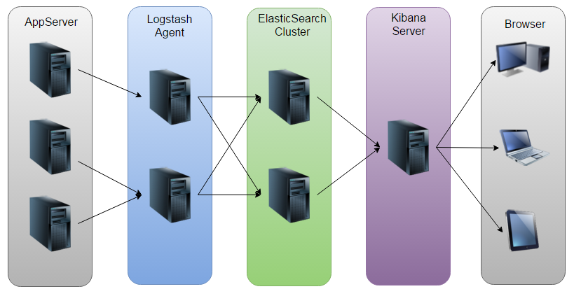 此架构由 Logstash 分布于各个节点上搜集相关日志、数据,并经过分析、过滤后发送给远端服务器上的 Elasticsearch 进行存储。