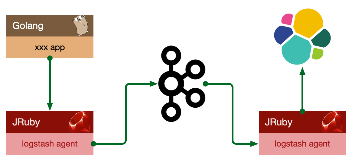 此种架构引入了消息队列机制,位于各个节点上的 Logstash Agent 先将数据 / 日志传递给 Kafka ,并将队列中消息或数据间接传递给 Logstash , Logstash 过滤、分析后将数据传递给 Elasticsearch 存储。最后由 Kibana 将日志和数据呈现给用户。因为引入了 Kafka ,所以即使远端 Logstash server 因故障停止运行,数据将会先被存储下来,从而避免数据丢失。