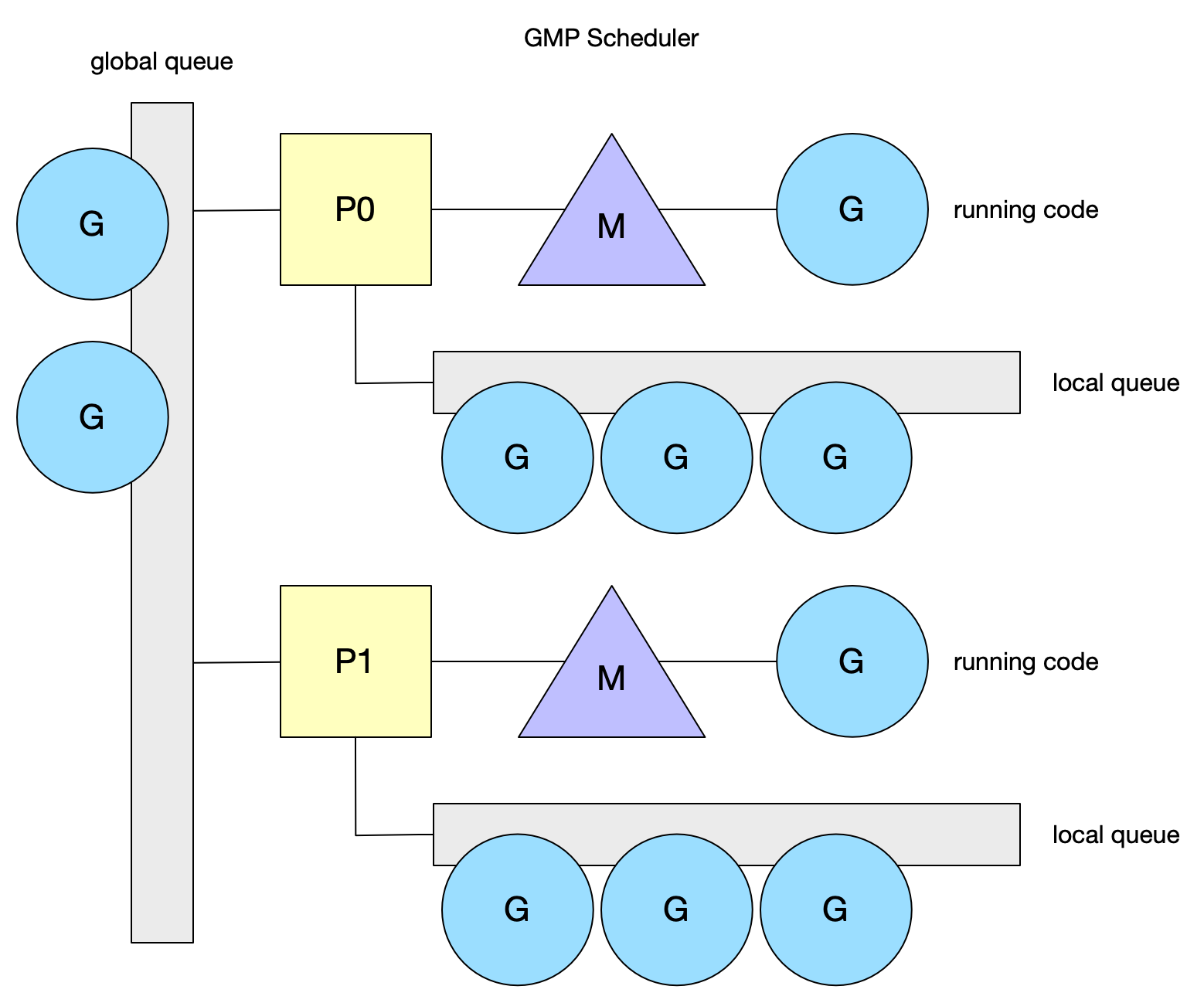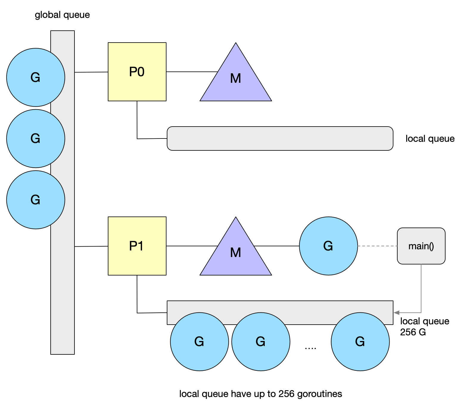 mcache/stackalloc 从 M 移到了 P ,而 G 队列也被分成两类,保留全局 G 队列,同时每个 P 中都会有一个本地的 G 队列。