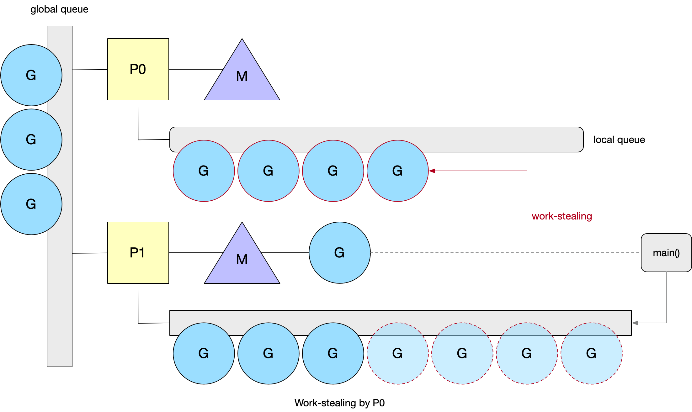当一个 P 执行完本地所有的 G 之后,并且全局队列为空的时候,会尝试挑选一个受害者 P ,从它的 G 队列中窃取一半的 G 。否则会从全局队列中获取 (当前个数 / GOMAXPROCS ) 个 G 。