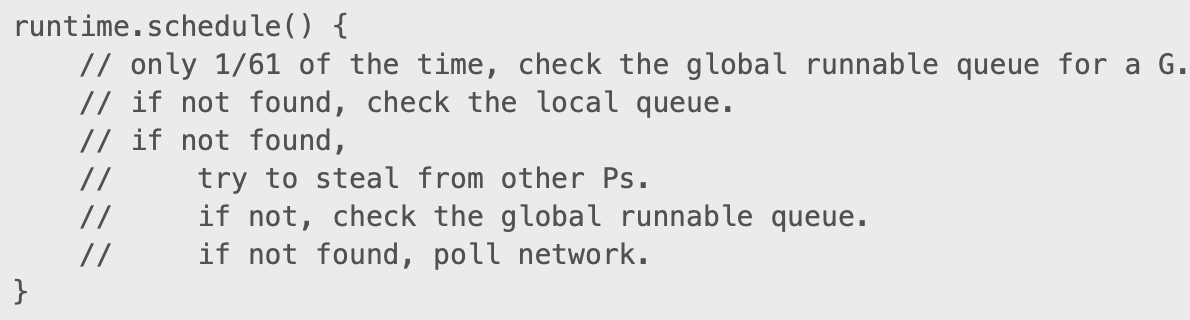 M带P的找G运行(一有runable的G就执行)。 这种情况下会首先 按照1/61轮次的查询global Queue, 然后再查看local Queue是否有G. 如果没有,则去查看Global Queue, 如果没有在去检查net poller, 看看是否有可用的goroutine.