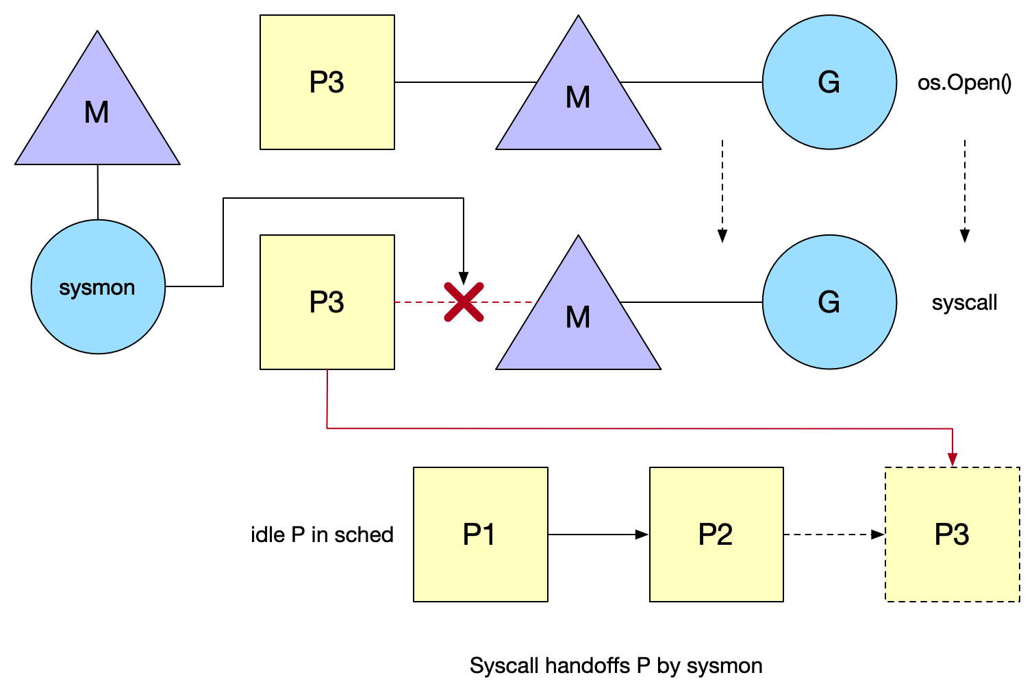 系统监视器 ( system monitor ),称为 sysmon ,会定时扫描。在执行 syscall 时,如果某个 P 的 G 执行超过一个 sysmon tick ( 10ms ),就会把他设为 idle ,重新调度给需要的 M ,强制解绑。