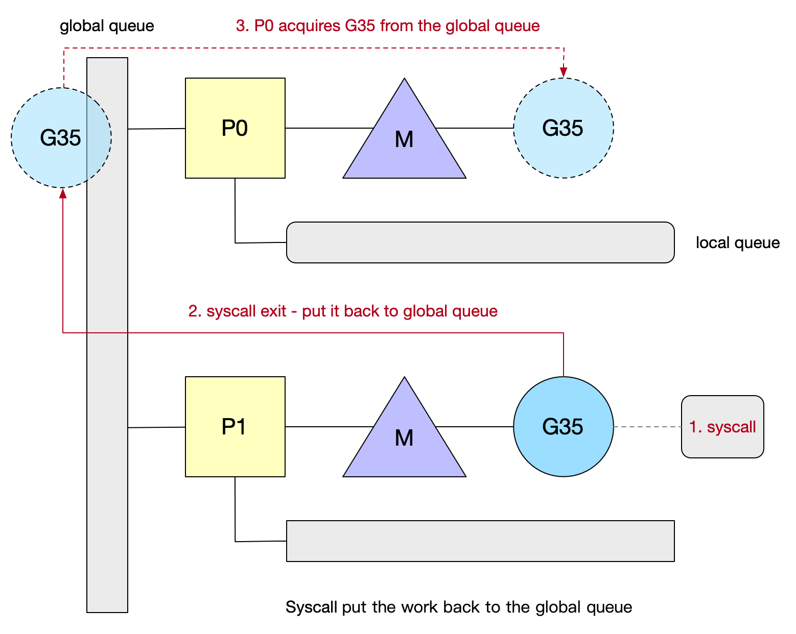 G35发生了系统调用,长时间没有返回。P1和M解绑。(p1不会马上被推送到idle list, 而是经过一段时间才会推送到idle list.) - 第二步: