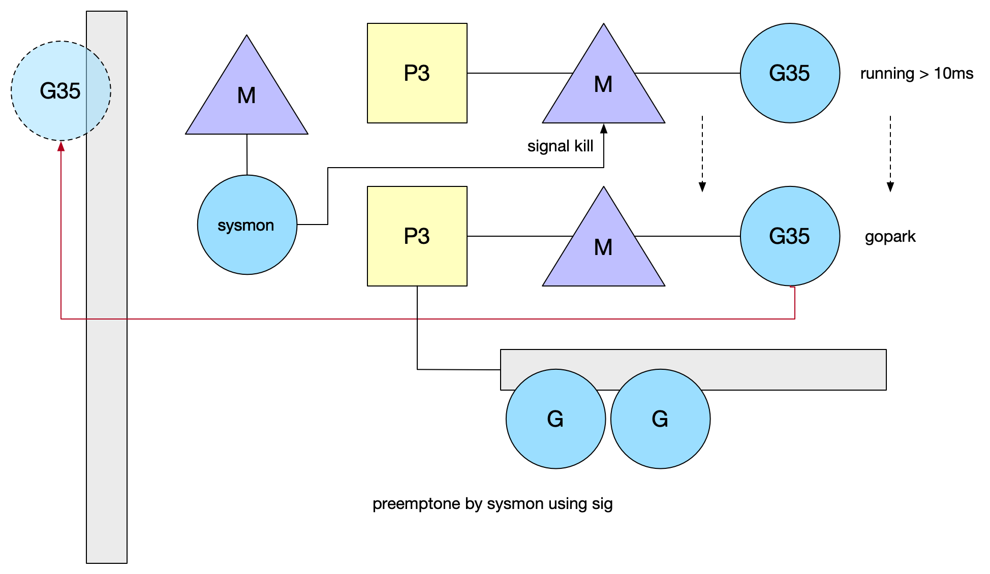 异步抢占,注册 sigurg 信号,通过 sysmon 检测,对 M 对应的线程发送信号,触发注册的 handler ,它往当前 G 的 PC 中插入一条指令 (调用某个方法),在处理完 handler , G 恢复后,自己把自己推到了 global queue 中。