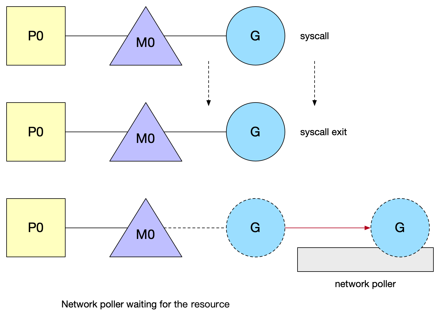 M进入系统调用,意味着M不知道何时可以醒来,那么M对应的P中剩下的G就得有新的M来执行,所以我们保留一个自旋的M来执行剩下的G(这时应该不存在类型2的自旋只有类型1的自旋)。 - 如果