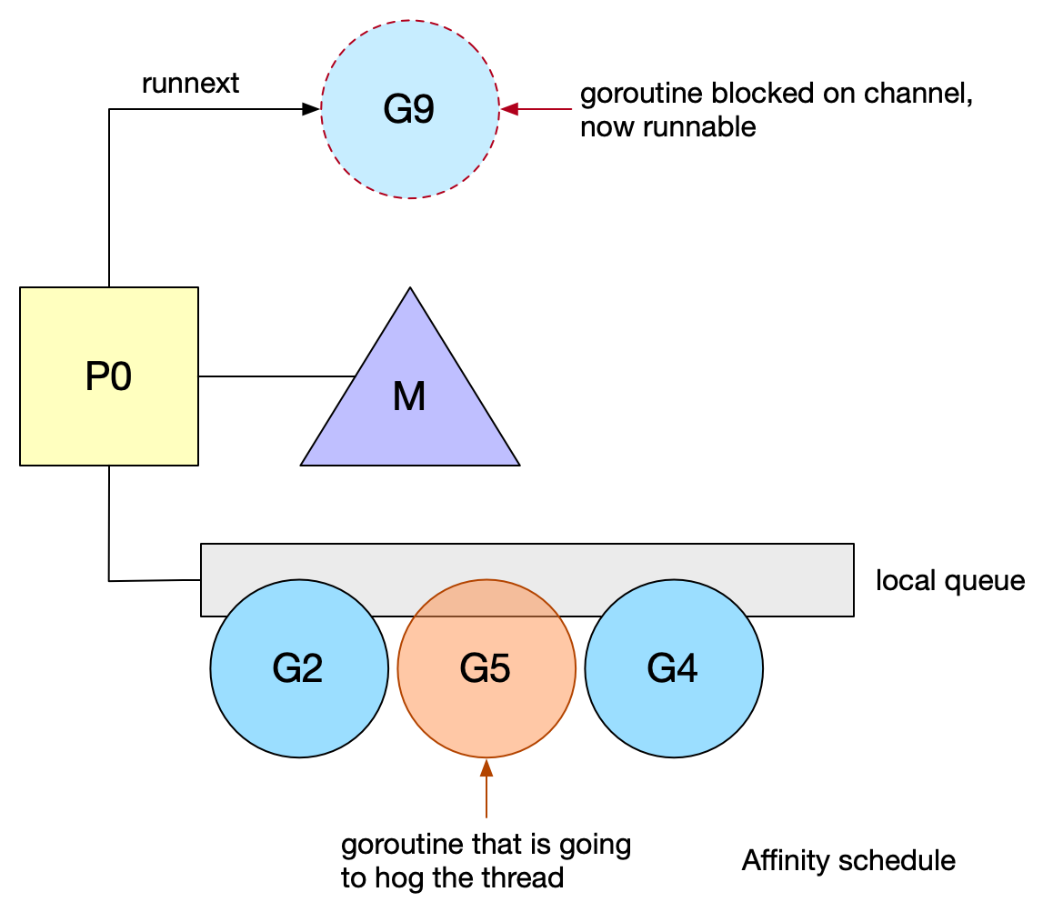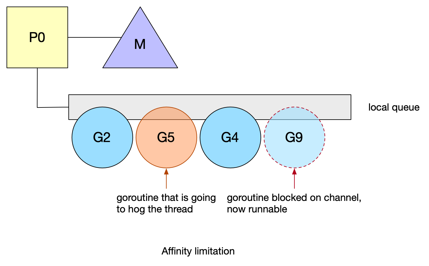 goroutine #9在chan被阻塞后恢复。但是,它必须等待#2、#5和#4之后才能运行。goroutine #5将阻塞其线程,从而延迟goroutine #9,并使其面临被另一个P窃取的风险。