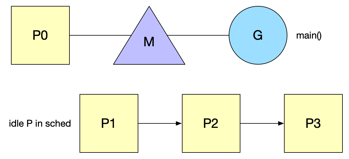 - 创建 P,绑定 m0 和 p0,首先会创建 GOMAXPROCS 个 P ,存储在 sched 的 空闲链表 (pidle)。