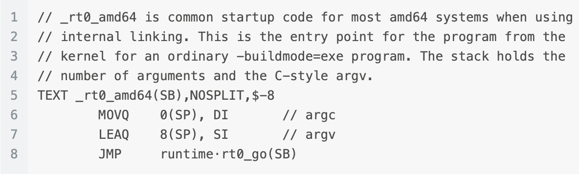 整个程序始于一段汇编,而在随后的 runtime・rt0_go(也是汇编程序)中,会执行很多初始化工作。