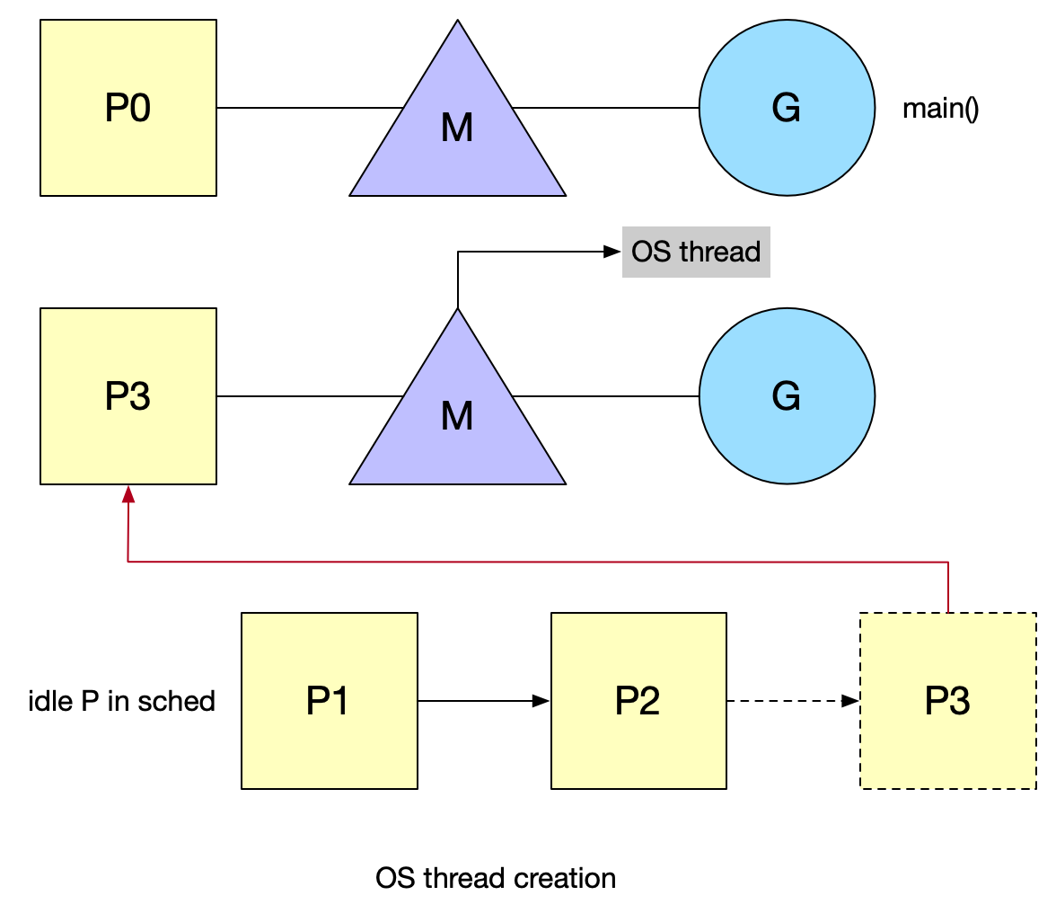 准备运行的新 goroutine 将唤醒 P 以更好地分发工作。这个 P 将创建一个与之关联的 M 绑定到一个 OS thread。