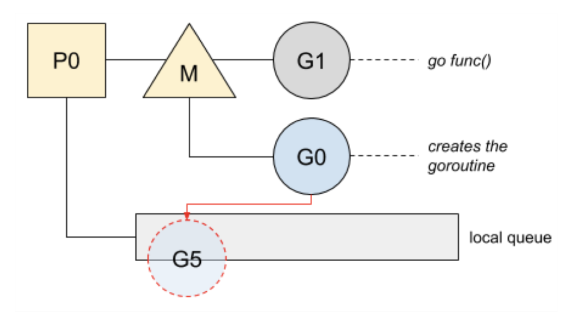 - 新建任务 g 到 p0 本地队列,m0 的 g0 会创建一个 指向 runtime.main () 的 g ,并放到 p0 的本地队列。