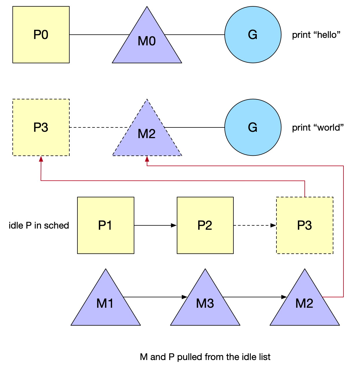 P3 和 M 脱离后目前在 idle list 中等待被绑定(处于 syscall 状态)。而 syscall 结束后 M 按照如下规则执行直到满足其中一个条件: