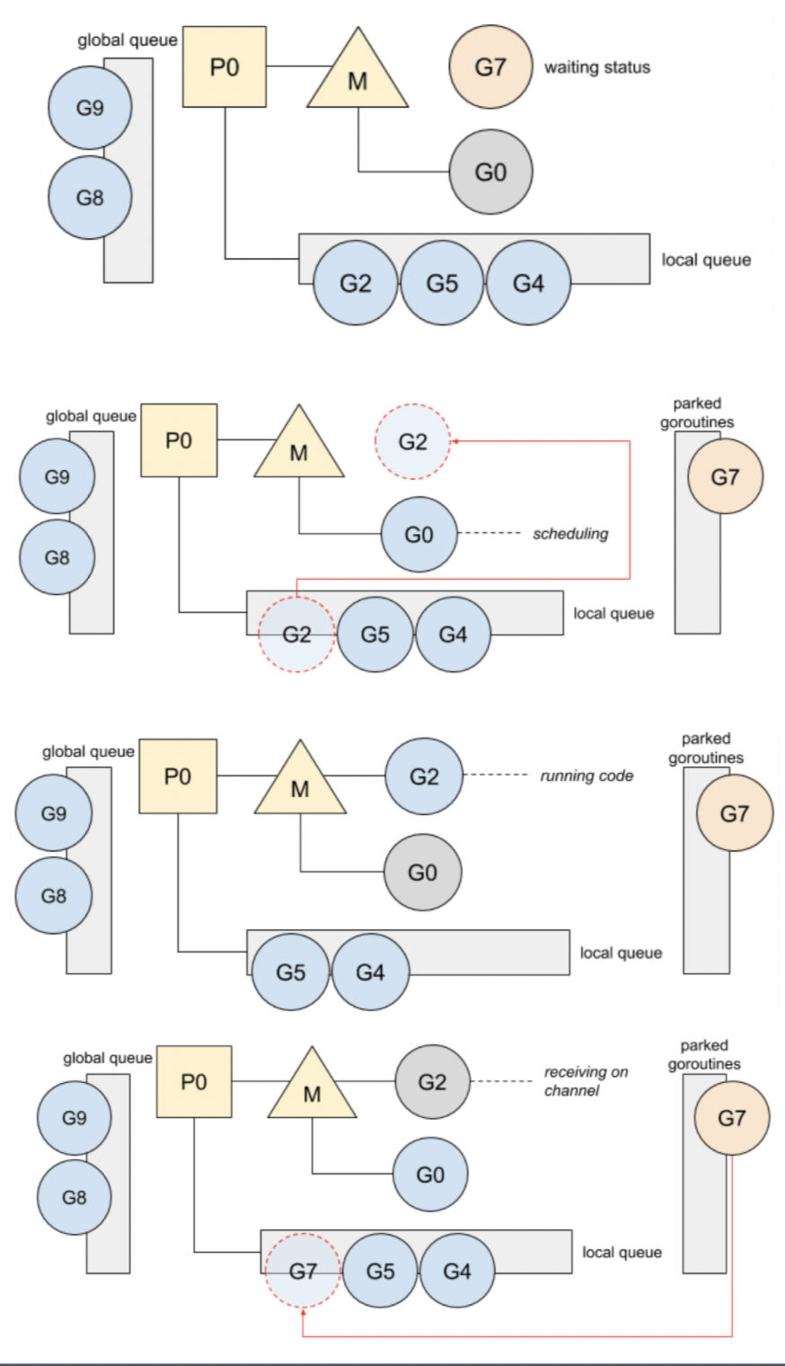 Goroutine#7正在等待消息,阻塞在chan。一旦收到消息,这个goroutine就被推到全局队列。- 然后,