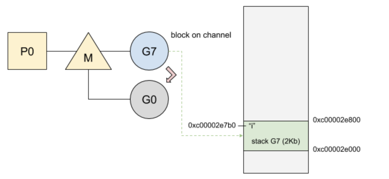 Goroutine在停止运行前执行的指令,程序当前要运行的指令是记录在程序计数器(PC)中的,G稍后将在同一指令处恢复运行;G的堆栈,以便在再次运行时还原局部变量;在切换之前,堆栈将被保存,以便在G再次运行时进行恢复: