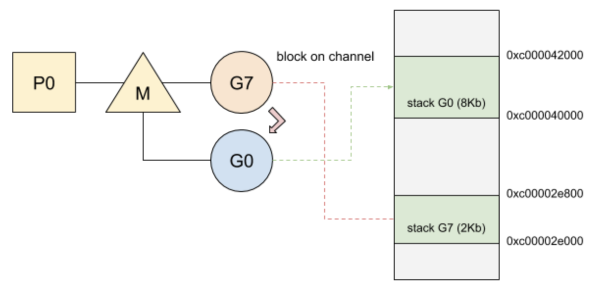 在这两种情况下,运行调度程序的g0将当前G替换为另一个G,即ready to run。然后,选择的G替换g0并在线程上运行。与常规G相反,g0有一个固定和更大的栈。 Defer函数的分配GC收集,比如STW、扫描G的堆栈和标记、清除操作- 栈扩容,当需要的时候,由