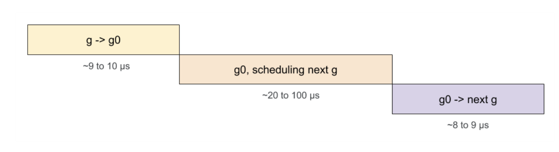 从 g 到 g0 或从 g0 到 g 的切换是相当迅速的,它们只包含少量固定的指令 ( 9-10ns )。相反,对于调度阶段,调度程序需要检查许多资源以便确定下一个要运行的 G 。