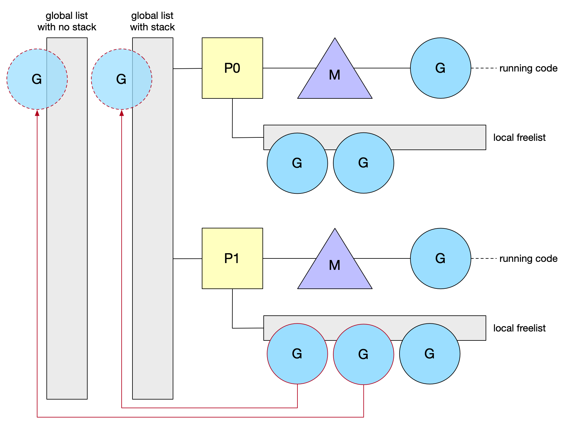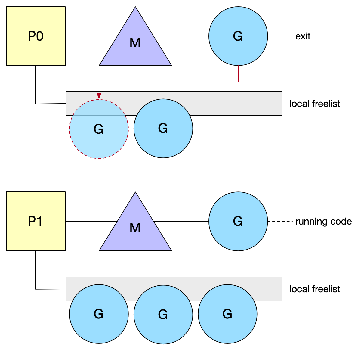 每个 P 维护一个 freelist G ,保持这个列表是本地的,这样做的好处是不使用任何锁来 push/get 一个空闲的 G 。当 G 退出当前工作时,它将被 push 到这个空闲列表中。