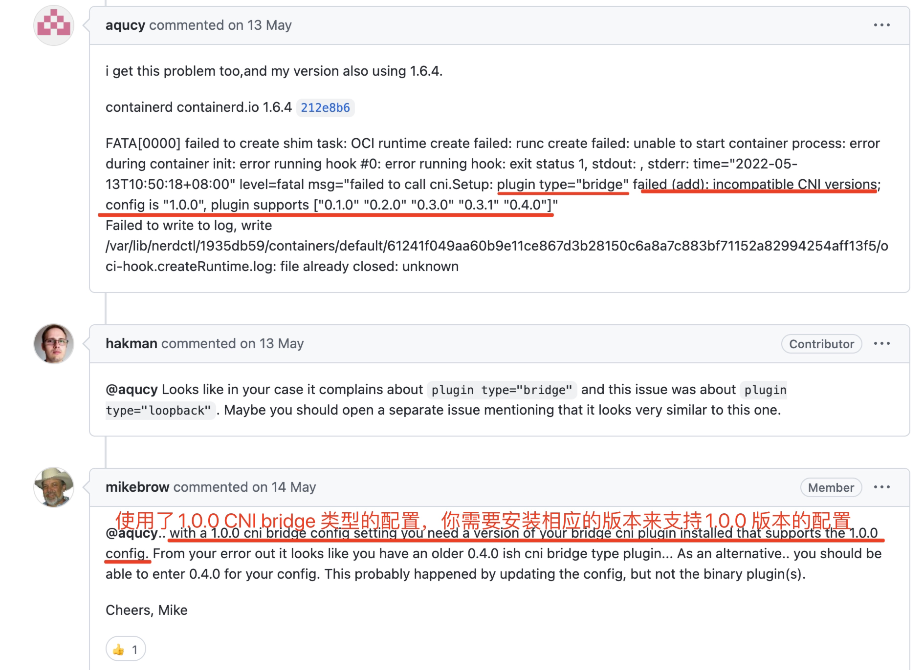 在 https://github.com/containerd/containerd/issues/6876 中,有一个人遇到了 v1.6.4 版本中出现了 incompatible CNI versions 这个问题。