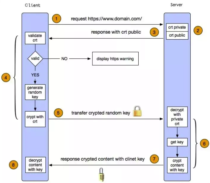 4. 客户端解析证书,由客户端的 TLS 完成,首先会验证公钥是否有效,比如颁发机构,过期时间等。如果有异常,就会弹出警告信息,并结束通信。如果正常,则生成一个随机值(用于对称加密),然后用服务端的公钥对随机值进行非对称加密。